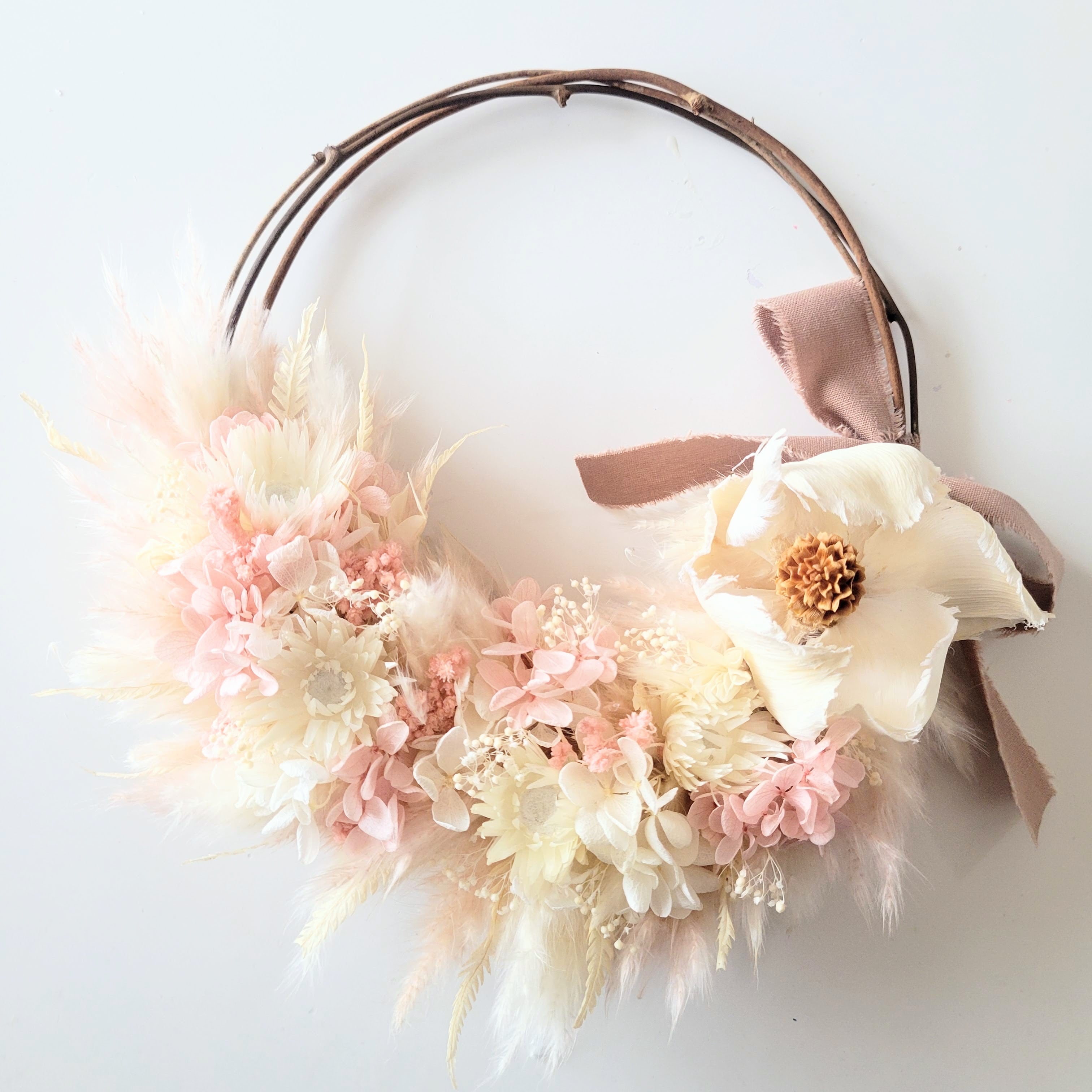 ふわふわのピンクベージュとホワイトのテールリードとパームフラワーをメインに使用したドライフラワーリースです。